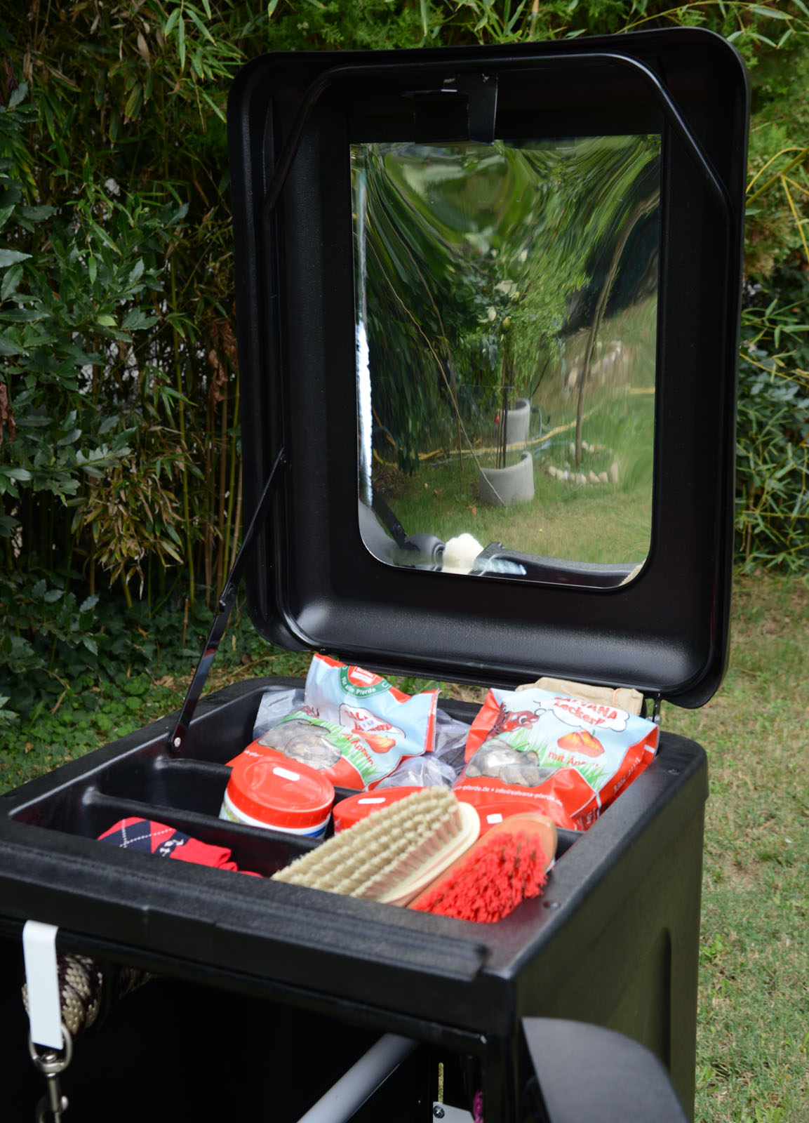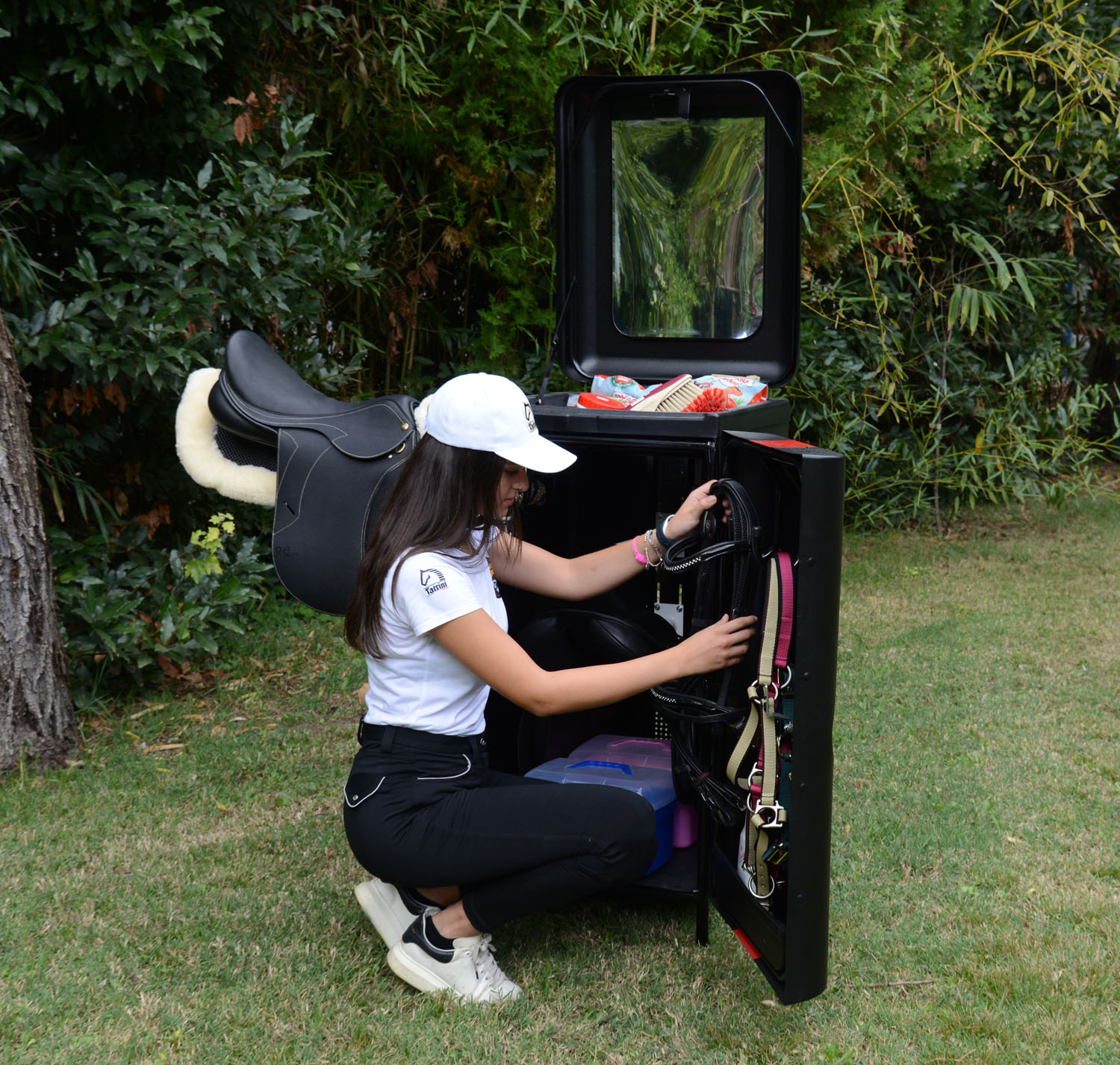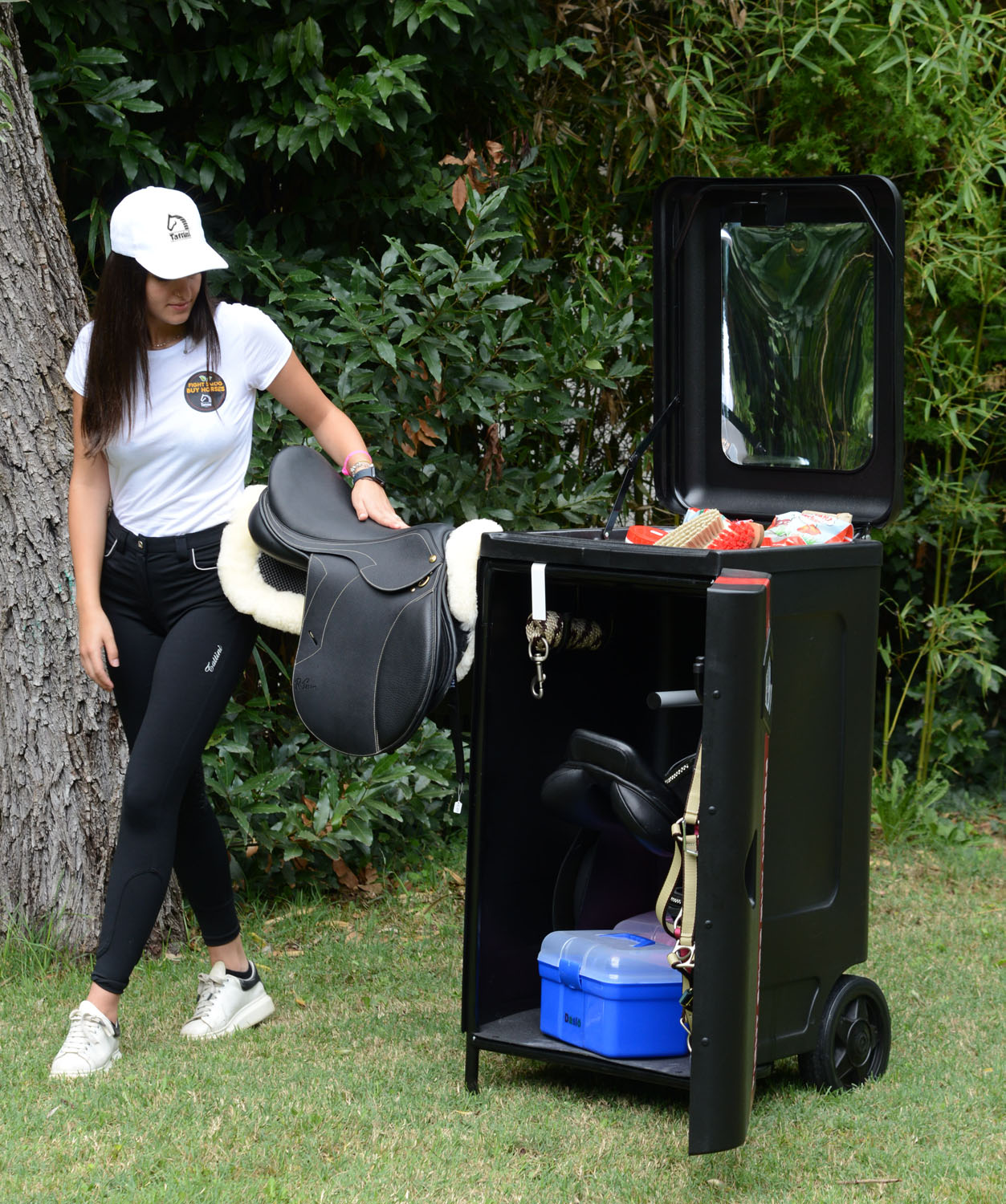 - A avea totul la îndemână este important acasă și devine fundamental în competiție. Lada portabila Tattini a fost proiectata si dezvoltata pentru a satisface nevoile celor care au nevoie să depoziteze, să păstreze ordonat și în siguranță sau să mute echipamentul ecvestru. Este ultra-ușoară și ușor de transportat, iar datorită roților mari încastrate, rezistente la perforare, poate trece cu ușurință și prin ușa dubei sau a remorcii. Noul corp este foarte robust și nedeformabil datorită cadrului autoportant acoperit cu material de înaltă densitate și ușor de curățat cu o cârpă umedă. În interior există spațiu amplu pentru două șei, pe suporturile confortabile detașabile pentru șa, precum și patru suporturi pentru ham; la exterior există un suport pentru șa detașabil foarte convenabil, în timp ce în interiorul ușii există încă două cârlige pentru căpăstru și un buzunar mare pentru sticle și recipiente.