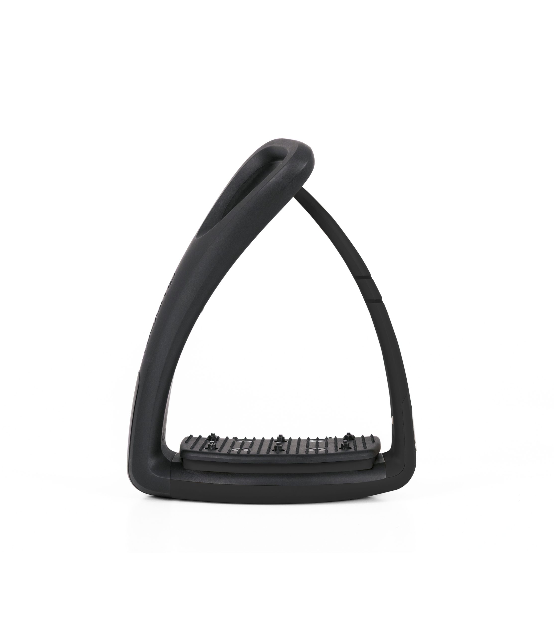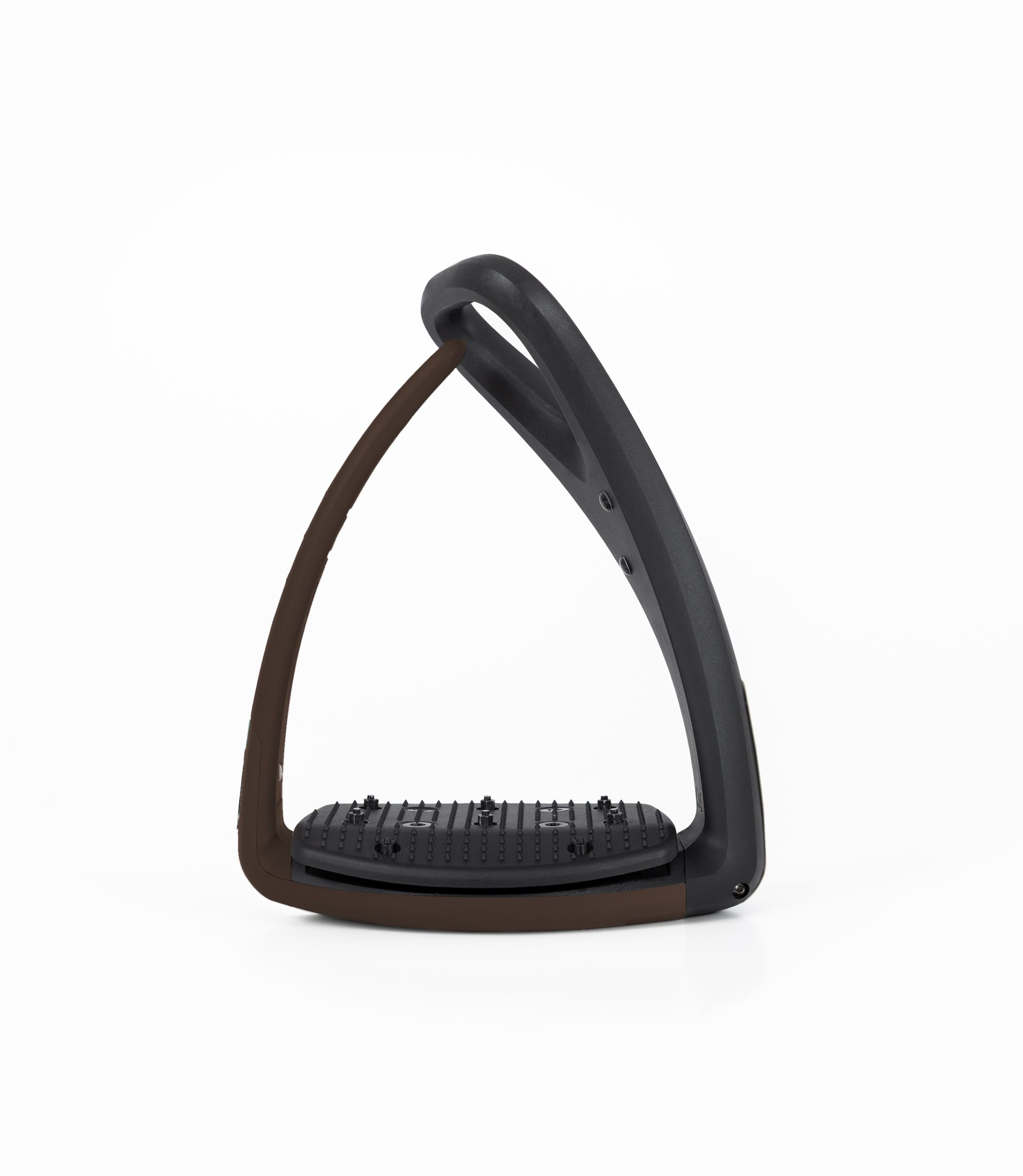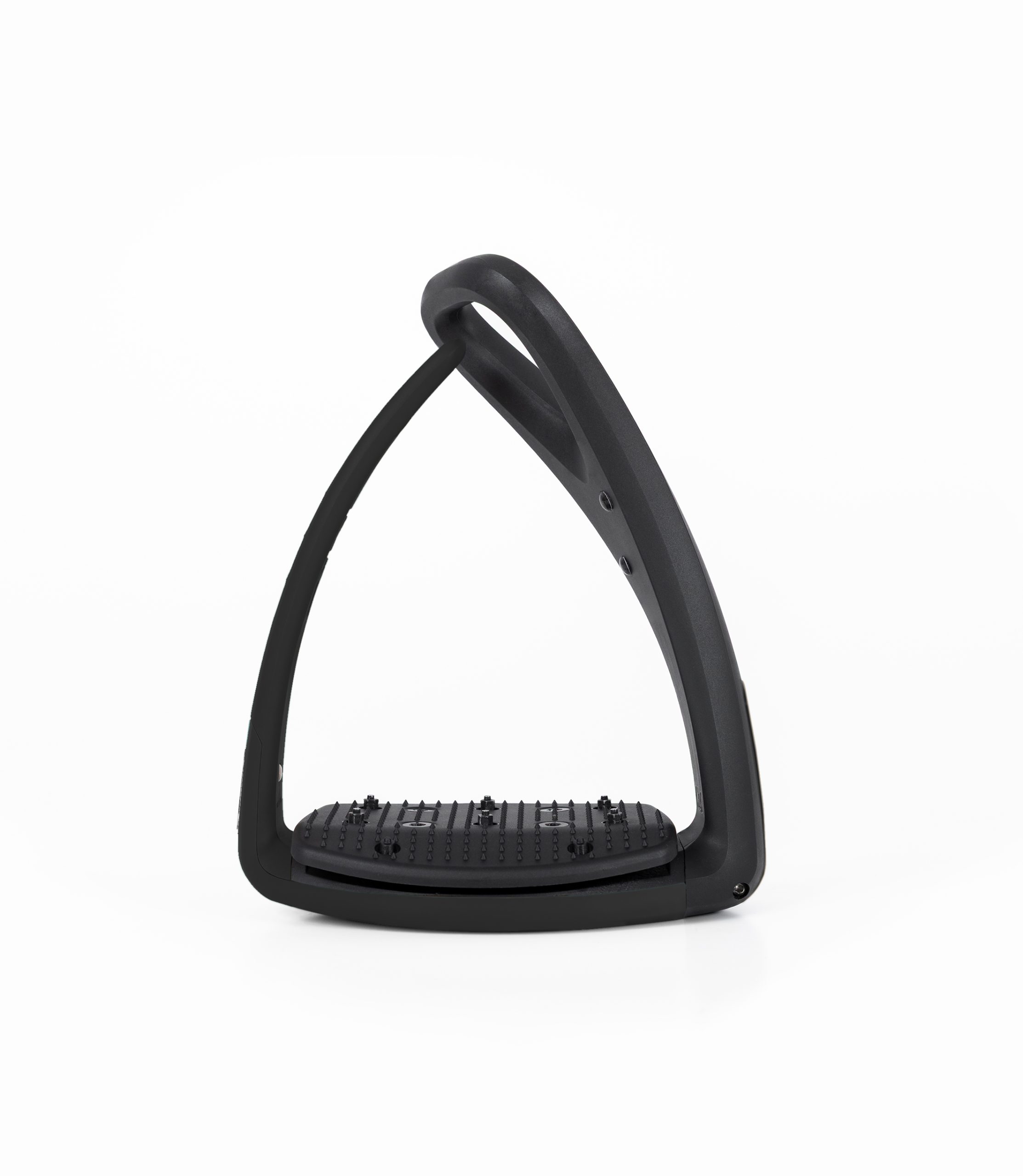 • Structura cu o singură ramură din oțel cu arc absoarbe până la 30% din forțele exercitate asupra etrierelor și este cuplată cu un elastomer de amortizare care acționează ca un adevărat sistem de absorbție a șocurilor, reducând solicitarea articulațiilor călărețului și a spatelui calului.