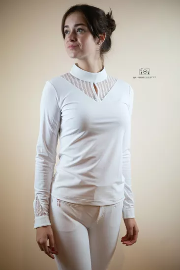 - Cămașa Béatrice este decorată cu dantelă pe guler și mâneci și cu un blazon Samshield realizat cu cristale Swarovski® pe o mânecă. Combină tehnica și rafinamentul.